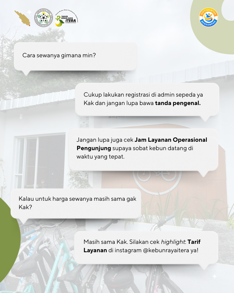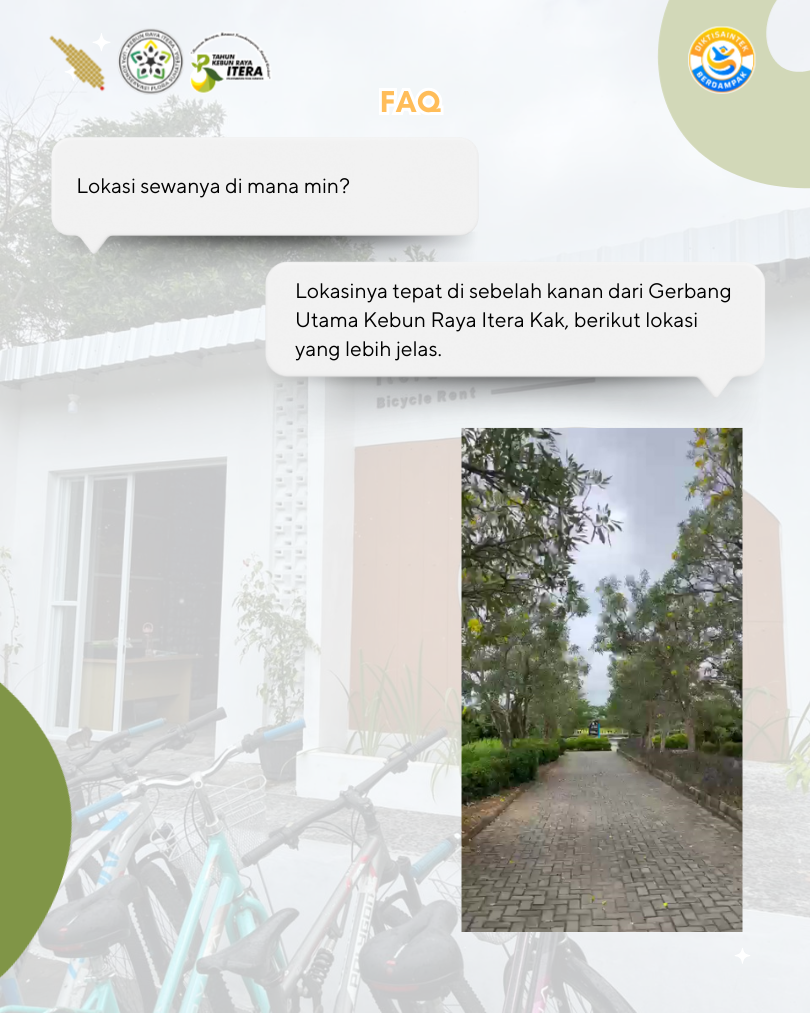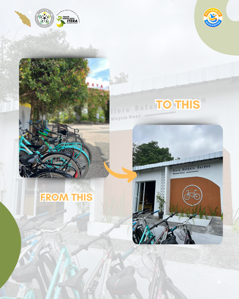 Kabar baik nih buat kalian pecinta gowes di Kebun Raya Itera, sekarang layanan sewa sepeda resmi pindah ke lokasi baru yang lebih nyaman. Area tunggunya lebih tertata dan pastinya makin asyik buat kalian yang mau siap-siap gowes sebelum berkeliling menikmati hijau dan segarnya suasana kebun.
